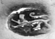 One of the oldest East European thimbles that we have found comes from Latvia (fig 31, 32). It depicts a harbour scene with a boat carrying the name ‘Riga’ (fig 33). It is marked with a maker’s mark (unknown), town marks (unknown) and a face facing left. It has a ‘backed’ steel top.