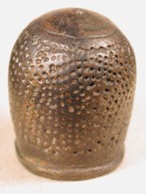 In Russia it used to be the custom to bury women with their thimbles and sewing tools so that early thimbles were often found in association with female burial sites. In a 14th - 15th century site close to Perm on the Kama river, jewellery, a coin dated to the mid 14th century and a thimble were discovered. The thimble was conical in shape with an open top and hand indentations. It was made from a copper alloy sheet and had a soldered seam (Fig. 3). Similar thimbles were discovered in Astrakhan further to the South-West of Perm. The thimbles date to the time of the Golden Horde and may have evolved from the same method of manufacture used in China and Scythia many centuries earlier. Pelham Burn and the Dutch Thimble Club (5, 6), however, think that this type of thimble was made in Nürnberg in the 15th or 16th century. We favour the Golden Horde origin because more of these thimbles seem to have been found in Russia than in Europe where they seem to be very rare.