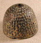 These three thimbles were found in Northern Afghanistan (Figs 4, 5, 6). The left hand thimble is open topped and derives from the open rings of China. It is cast bronze and probably dates to the 10th century. The second thimble, is a little later, is also cast but now has a top. There are also three crescents around the rim. The third thimble may be a development of the second thimble, in that the three rim crescents now extend up to the top of the thimble where there is a small knob. The thimble is very similar to those excavated at Hama in Syria (Fig. 8).