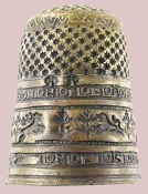 In the mid 16th century silver became more plentiful in Europe. People who would have bought the best Nürnberg brass thimbles could now have their thimbles made in silver or gold and many had inscribed messages around the rim. Nürnberg thimble makers also devised a two-part thimble that consisted of a gilded thimble with a detachable top (Fig. 76). Under the cap and on the top of the thimble was a small painting of a person or coat of arms and this was covered with a glass or crystal protection. A third element of the thimble was a filigree covering which slid on to the base. Often the filigree part is lost and the picture has faded so much that the image is impossible to decipher.
