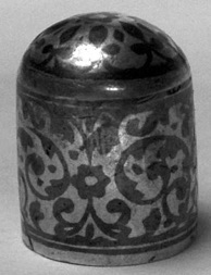 The cast Hispano-Moresque replica (fig 31) was correctly identified by Heirloom Editions Ltd but the two ‘Roman’ thimbles were not. The left ‘Roman’ thimble was, in fact, a replica of a thimble found in Hama, Syria (fig 34, 35). The other two thimbles were copied from thimbles made in Nürnberg in Medieval times.