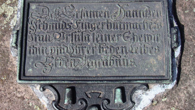 Cuncz Hofmon was possibly a thimble maker and a publican (personal communication, Dieter Pröbster). There are two plaques on the grave (Fig 46). The earliest plaque (Fig 47) comprises ashield containing a symbol (Meisterzeichen or ‘Hauszeichen’ [family or house sign]) below a rectangular epitaph: