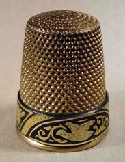 Damascening is the art of inlaying gold or silver into a darkly oxidized steel background. The term is derived from the resemblance of the damasked item to the patterns seen in damask silk. We have only seen gold used on thimbles.