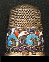 In 1704, the word "thimble" was first included in Fedor Polikarpov’s Trilingual Lexicon. A few years later, thimbles were amongst the items sold by the St. Petersburg merchant, Andreas Sendler (6). It appears that they were made from tombac (an alloy of copper and zinc) and in 1775 they cost four pennies each (6). Thimbles soon become fashionable amongst the aristocracy and were included along with scissors and needle cases in the contents of purse-like ‘chatelaines’, which were made in precious metals and which decorated their ball gowns. (6). Similar less expensive ‘chatelaines’ were carried by many women in Russia. They were usually made of locally obtained materials and contained various needlework items including thimbles. As in other countries (15) thimbles were used in Russia to decorate clothing in days gone bye.