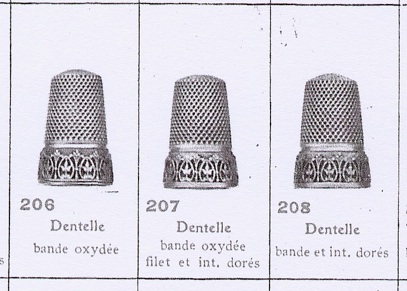Turning now to the thimble listed on Ebay. It was claimed that it was ‘a rare antique silver thimble because it once was a gift of love. The border of the thimble is actually a ring and when a lady accepted a thimble like this, she accepted the love of the one who presented it to her.’ The next statement reinforces the argument made above about size. ‘It is a small thimble, the ring doesn't even fit my little finger’. Examination of pictures of the ‘ring’ shows that the top edge has many sharp spikes, and the bottom is quite sharp. It would not be the sort of thing that one would give to a loved one to wear! It would be too uncomfortable; it would also be too small with a diameter of 15 mm. Further evidence that this ring is simply an applied band that has come loose comes from an A Féau catalogue, from the early 20th century, where a very similar thimble is illustrated – number 207 ‘Dentelle’. ‘band oxydée filet et int. dorés’. The thimble is also illustrated in ‘La folie des Des a Coudre’ (3) and again there is no evidence of a detachable ring.