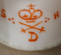 Porcelain thimbles often have details of the maker and country of manufacture stamped on the inside of the thimble (Fig 82). The artists of hand painted thimbles often sign their work (Fig 83) and makers of inexpensive metal thimbles may stamp their names or marks on the border or rim of the thimble (Fig 84).