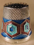 Russian enamel thimbles are made by soldering a thin filigree wire to the thimble border in order to make complex patterns. The shapes so produced are then filled with coloured enamels and baked. A thimble with many coloured panels would require many backings.