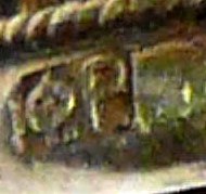 Fig 39. A silver mark, 84 zolotniks, left facing woman’s head, assay master’s mark (AB, possibly Alexander Virjohovsky) for 1896 – 1908. The photograph is of a similar mark but the assay master’s mark is AP (A Romanov).