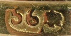 Most Russian gold thimbles are made out of 14 karat gold and have the fineness mark of 56 with the town mark (Fig 55). The marking is often very indistinct because the punches are bigger than the rim of the thimble so not all of the mark may be seen, and the mark may be badly rubbed. We have not been able to identify a date mark on a Russian gold thimble.