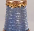 A Fabergé thimble (Fig 63) by Michael Perchin is thought to have been made around 1890 and has the workmasters mark (М.Π), ‘Fabergé’ in Cyrillic, the town mark for Saint Petersburg and 56 for the gold fineness in the top of the thimble. The inventory number (51660) is scratched inside the rim. The third example (Fig 64), also in a private collection, is a gold child’s thimble that is decorated above the rim in a Greek key design in turquoise champlevé enamel. The marks are unclear but it was supposedly made by Fedor Afanassiev who was also a Fabergé workmaster.